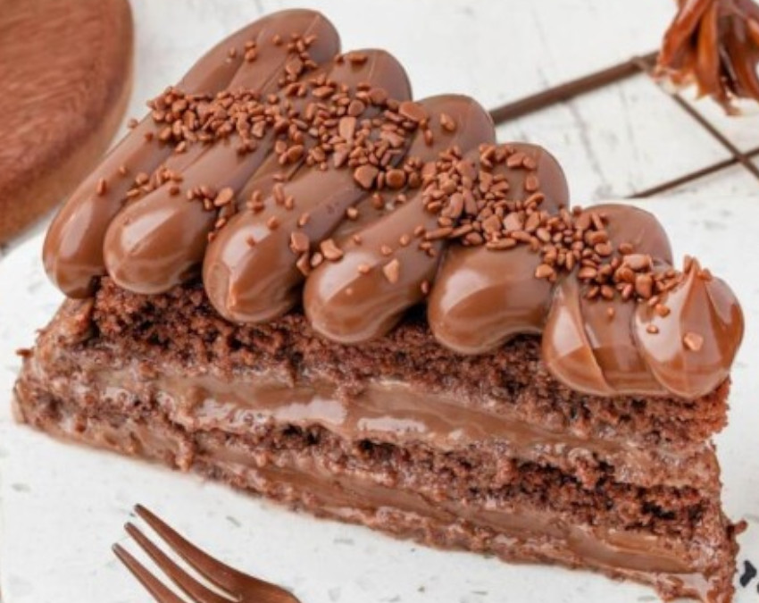 Fatia de bolo de chocolate com recheio de brigadeiro de coco e cobertura de chocolate.