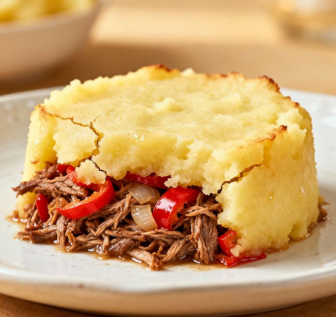 Fatia de bolo de chocolate com recheio de brigadeiro e coco.